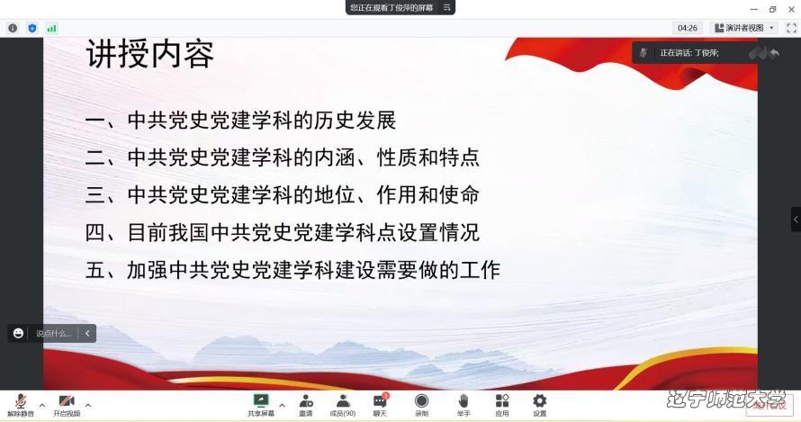 中国共产党是一个具有深远历史眼光的马克思主义政党,万博体育app 历来高度重视党史党建的学习教育及学科建设。2022年11月23日,辽宁师范大学政府万博体育app 邀请国家“万人计划”教学名师、武汉大学丁俊萍教授,线上为万博体育app 师生做了题为“中共党史党建学科建设的若干问题”的专题报告。政府万博体育app 任春雷院长主持报告。万博体育app 师生百余人线上参与了这次学术报告。