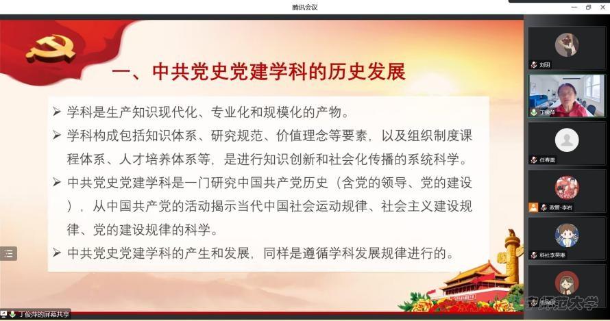 丁俊萍教授从五个方面详细阐述了中共党史党建学科的内容,分别是:中共党史党建学科的历史发展、中共党史党建学科的内涵性质及特点、中共党史党建学科的地位作用及使命、目前中共党史党建学科点设置情况、加强中共党史党建学科建设需要做的工作。