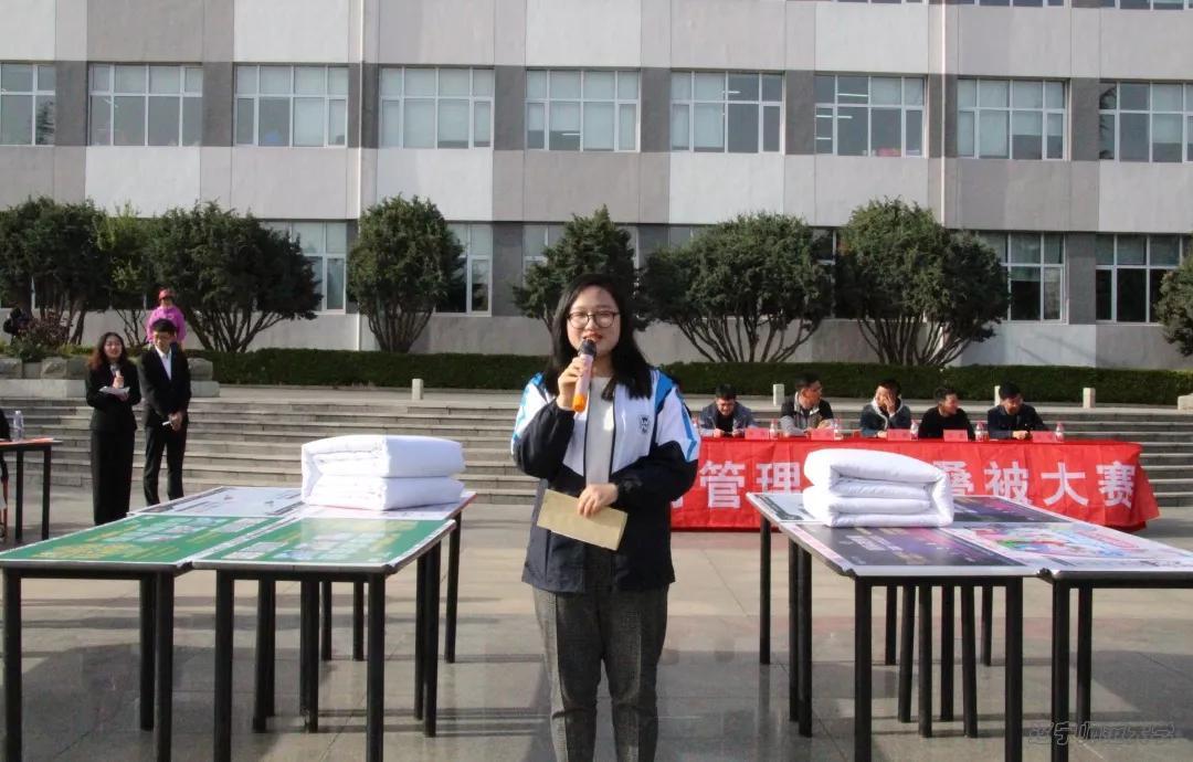 在第二轮团体赛中,同学们分工明确,齐心协力将被子叠成一个个整齐的“豆腐块”。叠被完成后,各班派一名同学现场抽取信封进行答题,同学们认真思考并且准确回答问题。